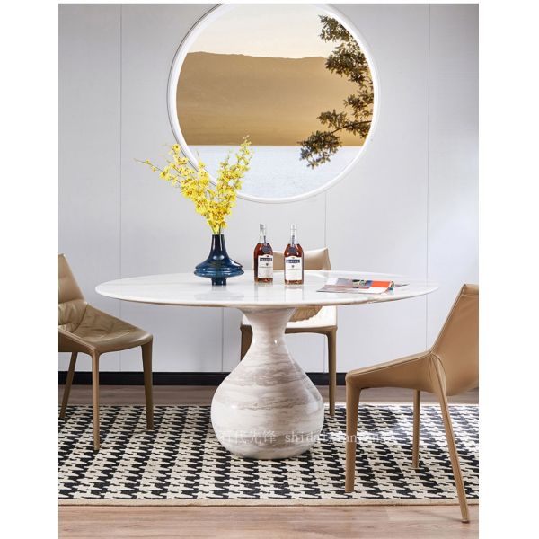 All in all, the Italian Style High-End Custom Round Natural Marble Dining Table is a beautiful and unique piece of furniture. Its natural marble material, swivel base and sophisticated design make it a highlight of home décor. Whether you use it for family dinners or business banquets, the practicality and beauty of this dining table will bring you an extraordinary dining experience.